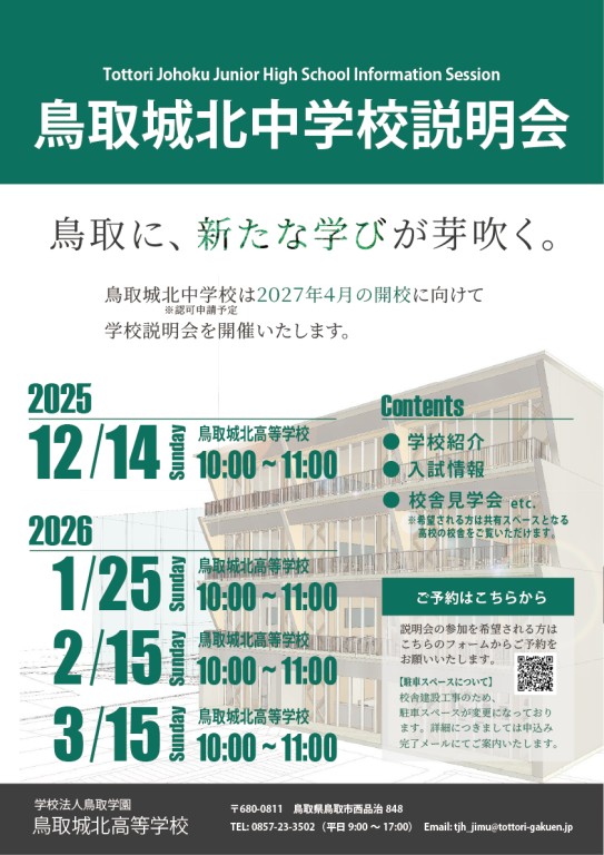 鳥取城北中学校(認可申請予定) 鳥取城北中学校(認可申請予定)について 鳥取城北中学校(認可申請予定)は、2027年4月の開校に向けて、学校説明会を下記の日程で開催いたします♪ 参加を希望される方は、こちらよりお申込みをお願いいたします☆ 2025年12月14日(日)10:00~11:00 2026年1月25日(日)10:00~11:00 2026年2月15日(日)10:00~11:00 2026年3月15日(日)10:00~11:00